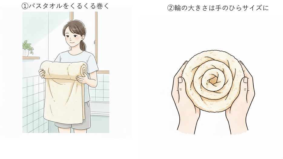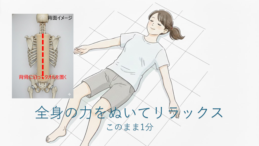 ③背骨にそってタオルの上にあおむけになり全身の力を抜いてリラックス