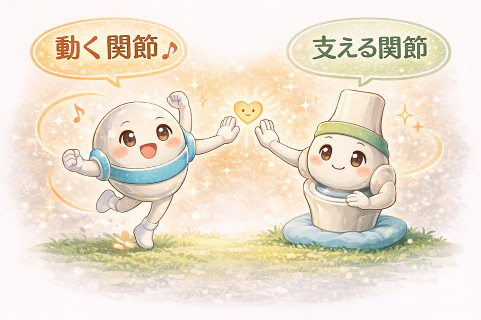 骨は体を支える土台であり、関節は骨同士の位置関係を保ちながら、動きをつくる“つなぎ目”の役割を担っています。