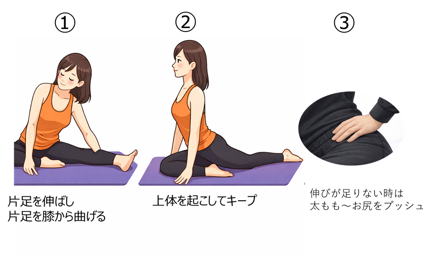 ③余裕があれば伸ばしている足の太ももからお尻に手で負荷をかけると股関節まわりの伸びを感じられます。
