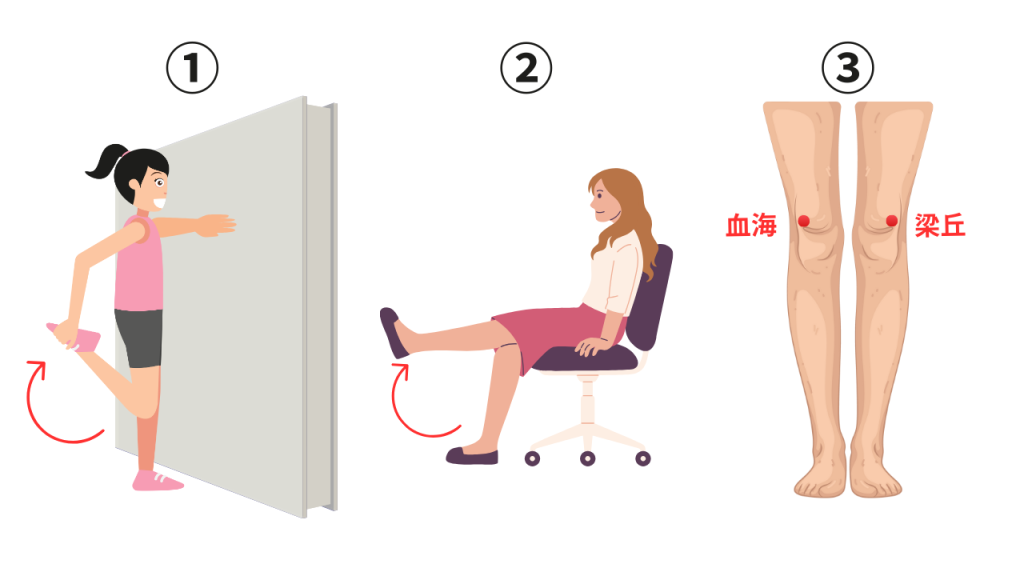 膝のお皿の上部指2本上の外側が梁丘(りょうきゅう)というツボです。その内側が血海(けっかい)というツボです。まずは梁丘(りょうきゅう)から、つぎに血海(けっかい)と順番に押していきます。