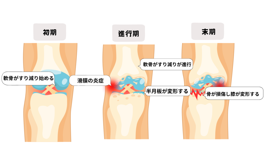 膝関節が痛む原因は靭帯や半月板の損傷など様々ですが、最も多いのが変形性膝関節症です。それでは、変形性膝関節についてみていきましょう。