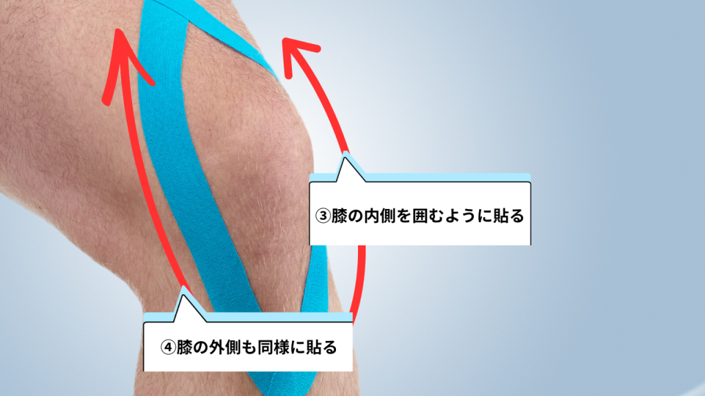 ③膝の内側を囲むようにテープを軽く引っ張りながら外側に向かって貼ります。