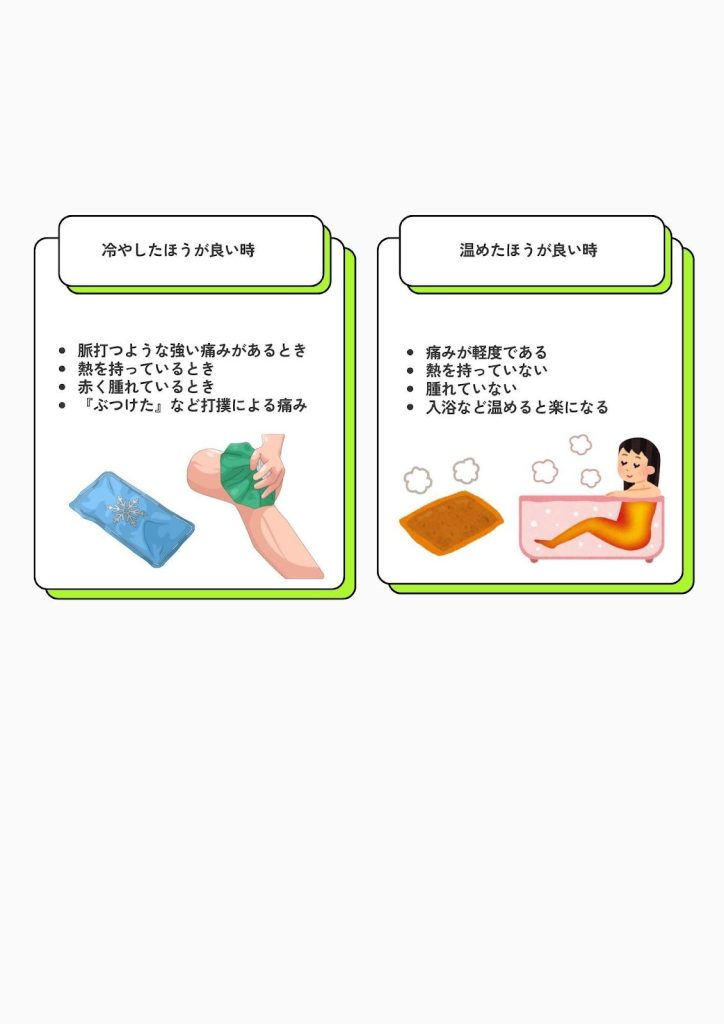 痛みが強い急性期は冷やすと血流を抑えて痛みが緩和します。逆に慢性的な痛みは温めると筋肉の緊張がゆるみ血流改善によって痛みの原因物質を排出するため、痛みが緩和されます。