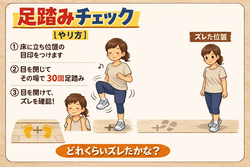• 目を閉じた状態で、その場で30回ほど足踏みします